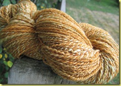 I’m not unhappy with the gold stuff, but it’s somehow different from the yarn I spin entirely on the wheel. Maybe the twist on my spindle-spun singles was less consistent? I’m not sure. The Polworth top was sooooo buttery and the yarn is less so. It’s not rough and rustic, exactly, but nor is it buttery soft. Learning curve is still on the way up, I guess! (Spinners, speak up if you have wisdom on this, please.)